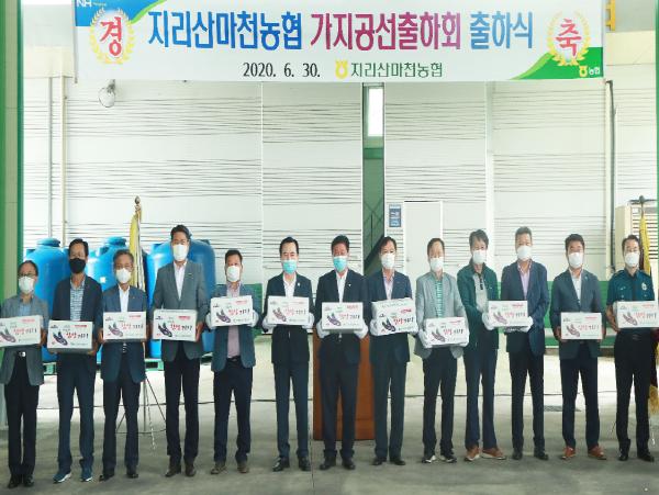 이날 행사는 지리산마천농협(조합장 조원래)과 가지작목반(반장 김영호)이 공선회를 조직하여 광주, 대전 대도시 공판장으로 계통출하는 하는 첫날로 서춘수 함양군수, 황태진 군의장, 노기창 NH농협은행 함양군지부장, 지역농업조합장 및 생산농가 등 50여명이 참석했다.