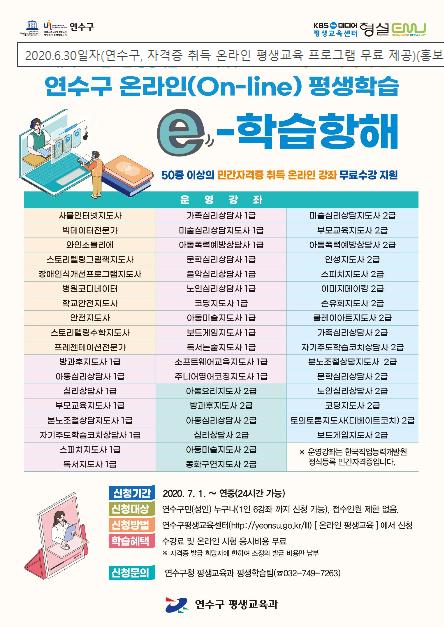글로벌 평생학습도시 연수구(구청장 고남석)는 연수구평생학습센터 홈페이지(http://yeonsu.go.kr/lll)를 통해 민간자격증 취득을 위한 온라인 강좌를 구민들에게 7월 1일부터 무료로 제공한다.