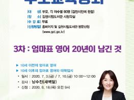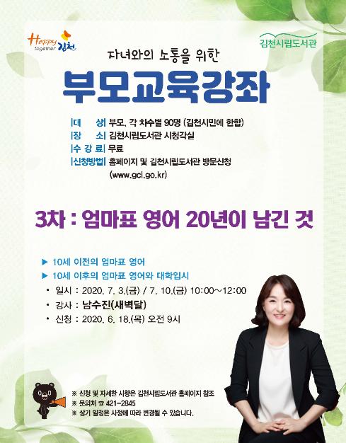 이번 부모교육 강좌는 엄마표 영어 교육의 대표자 ‘새벽달’ 남수진 작가가 “엄마표 영어 20년이 남긴 것”을 주제로 진행한다. 남수진 작가는 엄마표 영어 20년차 교육의 실전 노하우를 통해 힘든 영어 교육이 아닌 자녀 교육에 힘이 되어 주는 자생적 영어 교육방법을 전수 해줄 것으로 기대한다.