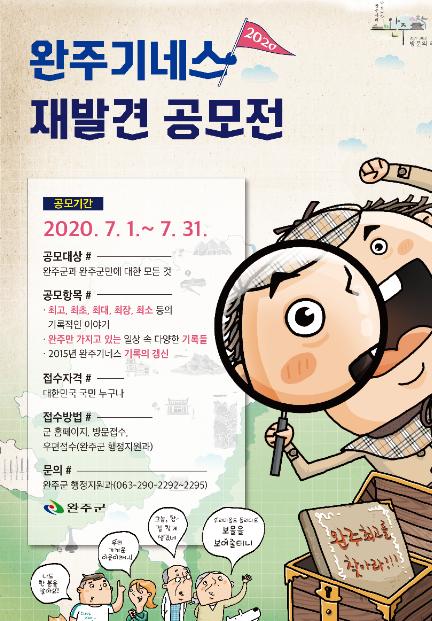 완주군이 2020년 7월 1일부터 한 달간 완주의 숨겨진 보물(명물, 자랑거리, 별난 이색기록 등)을 찾는 ‘완주기네스 재발견 공모전’을 실시한다.
