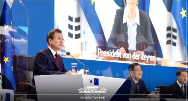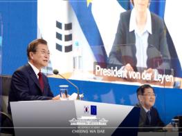 문재인 대통령은 오늘 오후, 샤를 미셸 EU 정상회의 상임의장 및 우르술라 폰 데어 라이엔 집행위원장과 화상 정상회담을 가졌다. 이번 화상 회담은 작년 말 출범한 EU 신지도부와의 첫 정상회담이자, 코로나 국면 이후 올해 최초로 개최된 양자 정상회담이다.