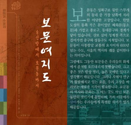 성북구(구청장 이승로) 보문동은 과거부터 현재까지 지역의 변천과정을 이야기로 풀어낸 스토리텔링 북 ‘보문여지도’를 발간하였다고 한다. 이 책자는 보문동 지역이 ‘숭신방’이란 행정구역으로 등장한 조선시대부터 현재의 성북구 보문동으로 바뀌기까지 지리적 정보를 기본으로 그 동안의 변화를 시대별로 풀어낸 자료집이다.