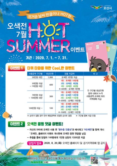 오산시(시장 곽상욱)는 지역화폐 ‘오색전’ 사용 활성화와 코로나19 여파로 침체된 내수 경기 회복을 위해 7월 한 달간 ‘오색전 7월 Hot Summer! 이벤트’를 실시한다.
