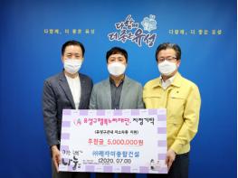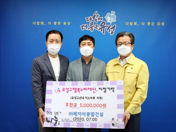 대전 유성구(구청장 정용래)는 1일 구청 행복사랑방에서 ㈜레자미종합건설(대표 이용운)이 유성구 행복누리재단에 후원금 500만 원을 기탁했다고 밝혔다.