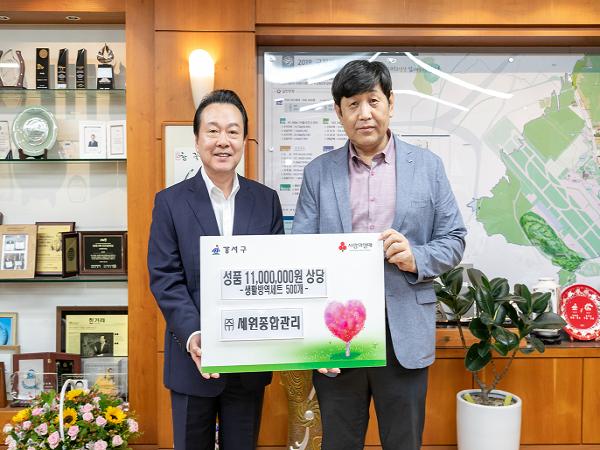 노현송 강서구청장은 1일 오후 3시 30분 구청장실에서 ㈜세원종합관리(회장 정화찬)로부터 ‘코로나19 극복 성품’을 전달받았다.