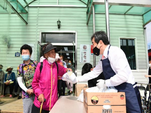 이후에는 평화동에 소재 하고 있는 무료급식소 야고버의 집을 찾아 지역 어르신 한분 한분에게 따뜻한 도시락과 함께 지역 사회의 정을 전하고, 농산물도매시장에서는 농산물 출하 농가주들과 도매상인들을 격려하였다.
