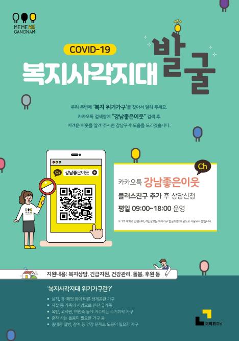 또 복지플래너, 우리동네돌봄단, 복지통반장 등이 집집마다 홍보에 나서는 한편, 문자 및 전화, 카카오톡 채널 ‘강남좋은이웃’ 등으로 비대면 발굴도 강화한다.