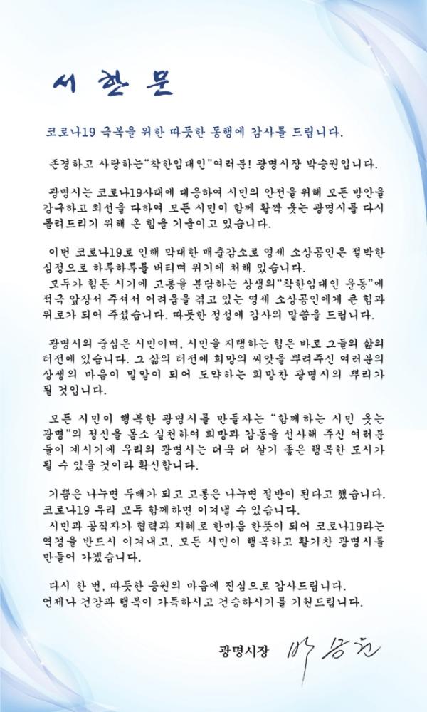 감사 서한문에서 박승원 광명시장은 “모든 시민이 행복한 광명시를 만들자는 「함께하는 시민 웃는 광명」의 정신을 몸소 실천하여 희망과 감동을 선사해 주신 여러분들이 계시기에 우리 광명시는 더욱 더 살기 좋은 행복한 도시가 될 수 있을 것이며, 시민과 공직자가 협력과 지혜로 한마음 한뜻이 되어 코로나19 를 반드시 이겨내자”며 “코로나19 사태로 인한 힘든 시기에 따듯한 상생의 마음을 보여주신 ‘착한임대인’에게 진심으로 감사드리며 언제나 건강과 행복이 가득하시고 건승하시기를 기원드린다”고 전했다.
