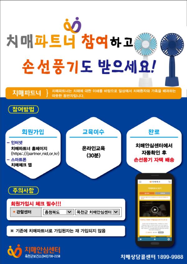 옥천군치매안심센터는 “치매파트너 동참하고 손 선풍기도 받고”라는 온라인 치매파트너 홍보 캠페인으로 지역 내 치매파트너를 양성한다고 밝혔다.