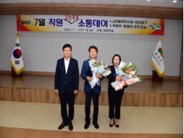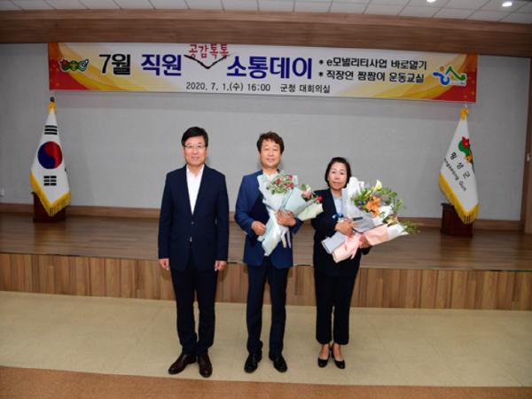 표창장 수여는 7.1일 개최된 ‘공감톡톡 소통데이’를 통해 진행되었으며, 모범공무원으로 선정되어 표창장을 받은 교육복지과 도만조 담당관과 농업기술센터 이인숙 농촌지도사를, 많은 동료 공무원이 함께 어우러져 축하하고 기쁨을 나누는 의미있는 시간으로 진행되었다.