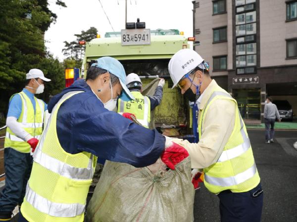 이 구청장은 이날 오전 6시 30분 염포동 일원에서 환경미화원들과 청소를 하는 것으로 하루를 시작했다. 환경미화원들과 함께 정해진 노선을 따라 문 앞에 배출한 재활용품을 수거하고, 주변에 남아 있는 쓰레기를 정리했다.