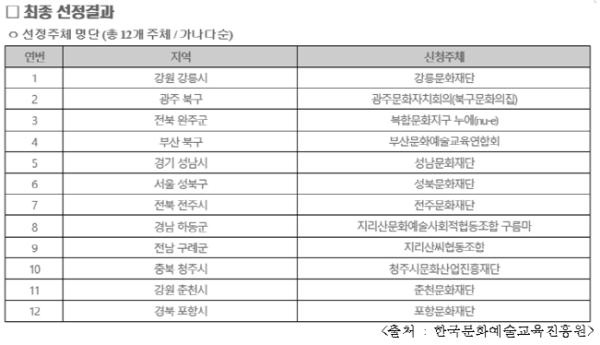 구례군 관계자는 “이 사업을 통해 기존의 마을공동체, 교육공동체, 문화예술인 등이 함께 지역에 활력을 불러일으킬 것”이라며 “주민들이 일상에서 문화예술교육을 누리는 계기가 될 것으로 기대한다”고 밝혔다.