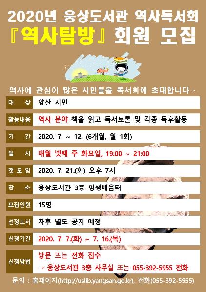 총 15명의 회원을 모집하며, 2020년 7월 7일(화)부터 7월 16일(목)까지 선착순으로 모집한다. 신청은 웅상도서관 3층 사무실 방문 또는 전화(055-392-5955)를 통해 가능하며, 기타 자세한 사항은 도서관 홈페이지(http://uslib.yangsan.go.kr)를 확인하거나 웅상도서관(☎392-5955)으로 문의하면 된다.