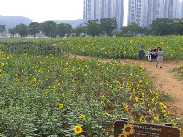 시는 최근 사회적 거리두기 여파로 가족과 함께 잠시 휴식을 취할 공간을 찾기 어려워지면서 인근 아파튼 단지 등과 어우러져 넓은 지역에 다양한 종류의 해바라기와 코스모스가 일제히 피어난 이곳을 찾는 방문객들은 계속 늘 것으로 전망하고 있다.
