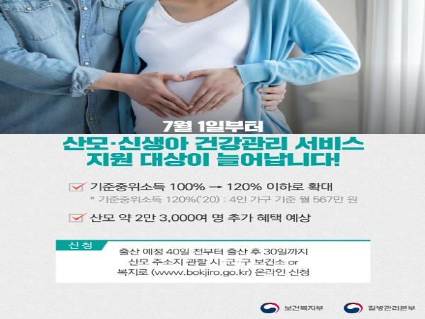 6일 시에 따르면, 산모신생아 건강관리사 파견 정부지원금의 경우 기존 기준중위소득 100%이하 가정에서 중위소득 120%(3인 가구 직장가입자 경우 15만 6,170원)이하 가정으로 확대했다.
