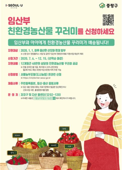 서울특별시 중랑구(구청장 류경기)는 지역 내 임산부 768명을 대상으로 친환경농산물 꾸러미를 지원한다고 밝혔다.
