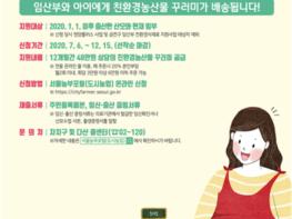 친환경농산물 지원서비스는 12월 15일까지 서울농부포털에서 선착순 모집한다. 신청 시 주민등록등본, 임신·출산 증빙서류를 제출해야 한다. 단, 영양플러스 사업 수혜자 등은 지원할 수 없다.