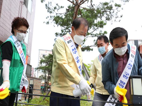 이날 류한국 구청장과 간부공무원들은 봉사담당 동행정복지센터를 방문해 주민들과 함께 공원 내 운동기구, 버스정류장, 공중화장실 등 다중이용시설에 대한 소독 작업을 실시하고 코로나19 극복을 위한 7대 기본생활수칙 준수 캠페인도 함께 진행했다.