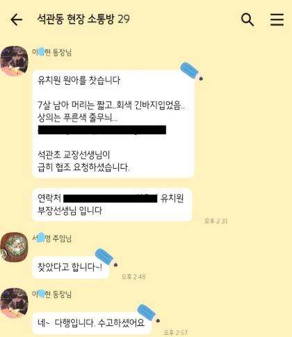 협조요청을 받은 즉시 석관동장은 ‘석관동 현장소통방’ 및 실시간 ‘주민 소통방’에 실종 아동의 인상착의(짧은 머리, 푸른색 줄무늬 상의, 회색 긴바지), 이름, 주소 등을 전달하였다.