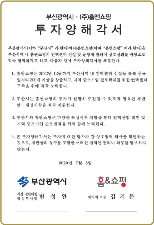 부산시(시장 권한대행 변성완)는 7월 8일 오전 11시 시청 12층 소회의실(Ⅱ)에서 변성완 시장 권한대행, 김기문 ㈜홈앤쇼핑 이사회 의장, 이원섭 ㈜홈앤쇼핑 부사장이 참석한 가운데 「홈앤쇼핑 컨택센터 부산 신설투자」에 대한 투자양해각서(MOU)를 체결한다고 밝혔다.
