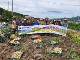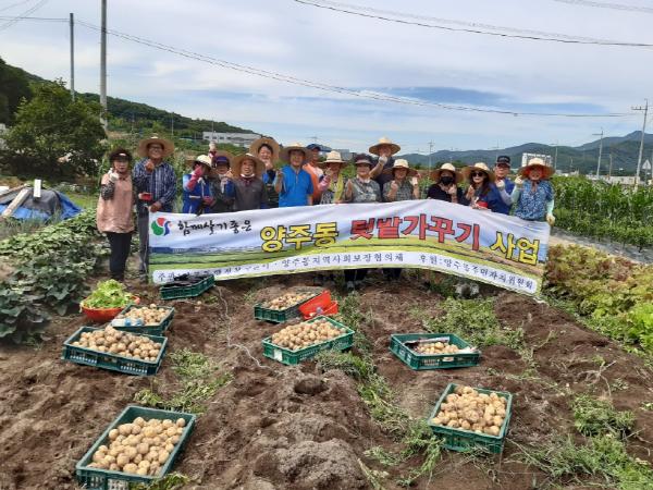 양주동 지역사회보장협의체(공공위원장 동장 이미란, 민간위원장 김영욱)는 7월 2일 양산시 상북면 신전리 258번지 “양주동 나눔 텃밭”에서 감자 500㎏, 고추, 가지 등을 수확하였다.