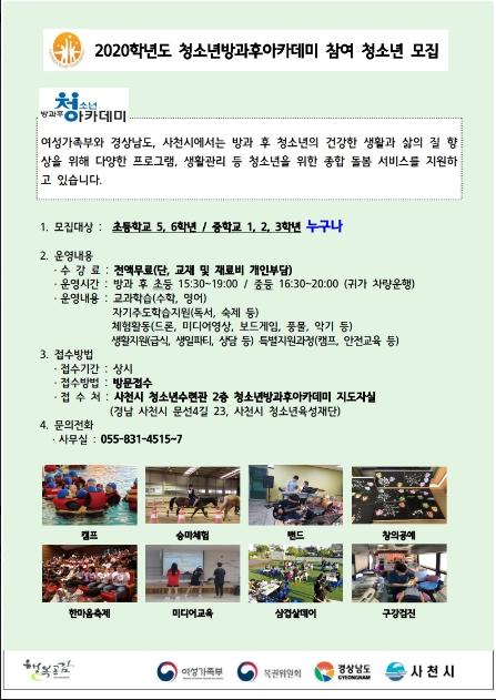청소년 방과후 아카데미는 사천시와 여성가족부의 국가정책 지원 사업으로 방과후 돌봄이 필요한 청소년에게 학습지원, 안전관리, 지역사회 참여, 다양한 체험활동의 프로그램을 운영하고, 청소년의 심리적, 신체적 지원 등 교육시설과 전문화된 활동?보호?복지서비스를 기반으로 종합 돌봄 서비스를 지원한다.
