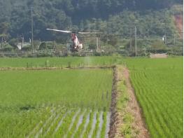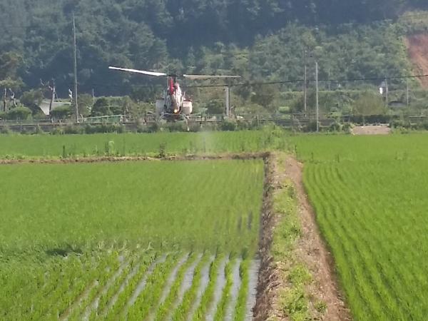 의령군은 농촌노동력 부족과 고령화에 따른 노동력 절감과 방제효율 극대화를 위하여 무인헬기를 이용한 벼 병해충 공동방제를 7월 1차 방제를 시작으로 10월까지 실시한다고 밝혔다.