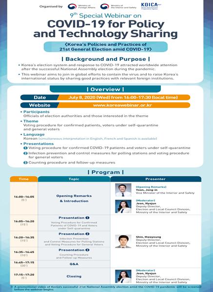 이번 9차 웹세미나는 국제 방역협력 총괄 전담팀(TF) 주관 하에 우리 방역 경험을 주제별로 구성하여 국제사회와 체계적으로 공유하는「K-방역」시리즈의 마지막 세미나로, 행정안전부(장관 진영) 주관으로 ‘코로나19 상황 속 선거분야의 정책 및 경험’을 주제로 진행된다.