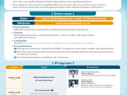 이번 웹세미나는 윤종인 행정안전부 차관의 개회사를 시작으로 ① 코로나19 확진자 및 자가격리자의 투표시스템, ② 투표소 방역대책 및 일반유권자의 투표시스템, ③ 개표방법 및 투표 이후 사후조치에 대해 발표한다.