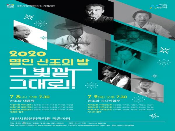 대전시립연정국악원에서는 오는 8일과 9일 오후 7시 30분 기획공연 2020년 명인 산조의 밤 ‘그 빛깔 그대로’를 유튜브(Youtube) 온라인 생중계 공연으로 선보인다.
