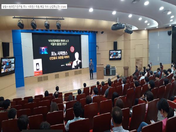 한국전기연구원(KERI) 대회의실에서 실시된 이번 특강은 인공지능(AI)와 4차 산업혁명 시대를 맞이하여 스마트 폰이 낳은 신인류, ‘포노 사피엔스’가 문명의 표준이 되어 전 세계 비즈니스와 자본의 판도를 바꾸는 가운데 창원시와 한국전기연구원의 구성원들이 이런 변화를 깨닫고 이를 각자의 업무와 연구에 적용해보자는 취지로 마련되었다.