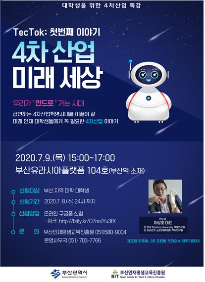 ‘공유대학 대학생 특강’은 4차산업 혁명, 금융, 미래유망 직종 및 문화콘텐츠 분야 관련 저명인사 특강을 통해 지역 대학생의 역량 강화와 미래 융복합 인재로서의 소양을 갖출 기회를 제공하는 사업이다. 첫 번째 특강으로 7월 9일 오후 3시부터 2시간 동안 부산역 유라시아플랫폼 104호에서 3D프린팅 기반 전자의수를 제작하는 스타트업 ‘만드로㈜’의 이상호 대표를 초청해 ‘4차산업 미래세상에 대한 이야기’를 들어볼 예정이다.