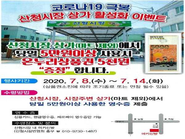 산청군이 코로나19로 어려움을 겪는 전통시장과 골목상권을 되살리기 위한 소비촉진 행사로 ‘온누리상품권 페이백 이벤트’를 실시한다.
