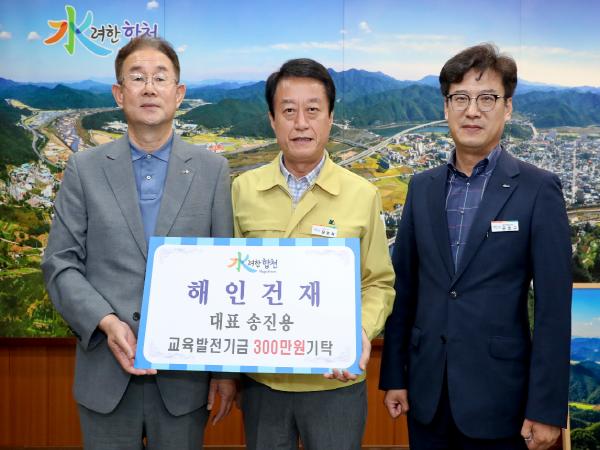 해인건재 송진용 대표는 8일 (사)합천군교육발전위원회(이사장 문준희)를 방문하여 지역 인재 양성을 위해 보탬이 되고 싶다며 교육발전기금 3백만원을 기탁했다.