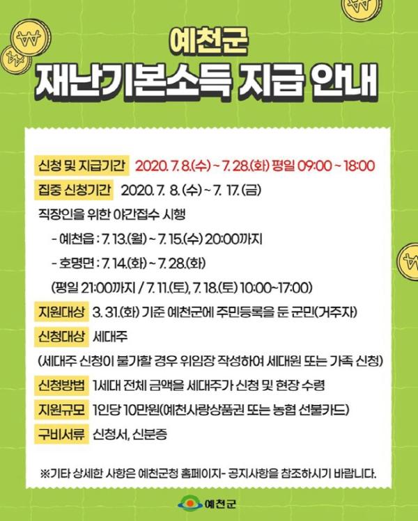 다만, 신청일에도 예천군에 주민등록을 둔 군민에 한하며 재외국민, 거주불명자는 지급 대상에서 제외되고 동거인은 개별 신청해야 한다. 또한, 가정폭력 등 사유로 세대주가 본인의 재난기본소득을 수령하는 것에 이의가 있는 경우 예외적으로 개별신청이 가능하다.