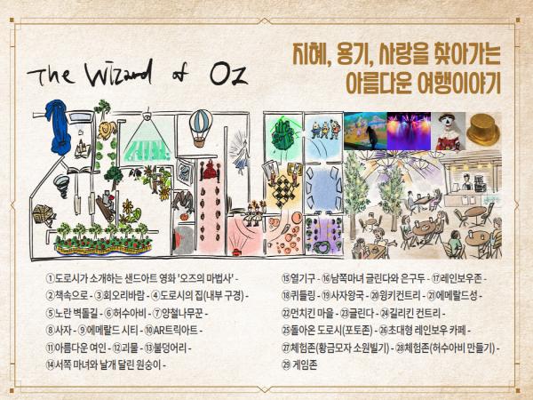 주인공 도로시는 회오리바람에 날려간 곳에서, 다시 캔자스의 집으로 돌아가기 위한 먼 여행을 떠나는데, 전시장을 찾은 관람객들은 노란 벽돌길을 따라 간다. 주인공 도로시는 오즈의 마법사가 살고있는 에메랄드시로 가는 길에 어려움에 처한 허수아비와 양철나무꾼,사자를 만나 동행하면서 많은 어려움을 함께 헤쳐나가는데, 이번 전시회에서는 도로시가 집을 떠나 다시 집으로 돌아오게 되는 모든 장면들이 어떻게 만들어져 있을지를 상상해 보는 특별한 즐거움이 하나의 선물처럼 꾸며져 있다.