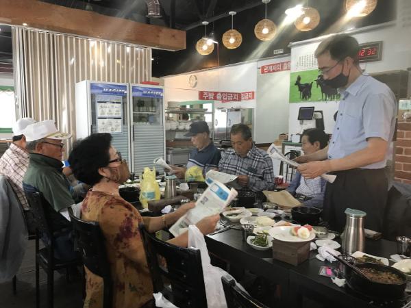 진미동(동장 김진오)에서는 2020. 7. 7.(화) 관내 식당에서 무더운 날씨에도 불구하고 코로나 19 감염확산 예방을 위해 고생해주신 진평 경로당 등 6개소 경로당 회장님들의 노고를 격려하고자 간담회를 실시하였다.