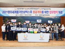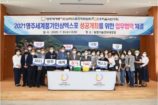 영주세계풍기인삼엑스포조직위원회(위원장 장욱현)는 ‘2021영주세계풍기인삼엑스포’의 경쟁력 제고 및 지역 특색에 맞는 행사 운영을 위해 지난 8일 농업기술센터 대강당에서 ‘우리음식연구회(회장 박순화)’와 『2021영주세계풍기인삼엑스포』 성공개최를 위한 업무협약을 체결했다.