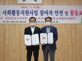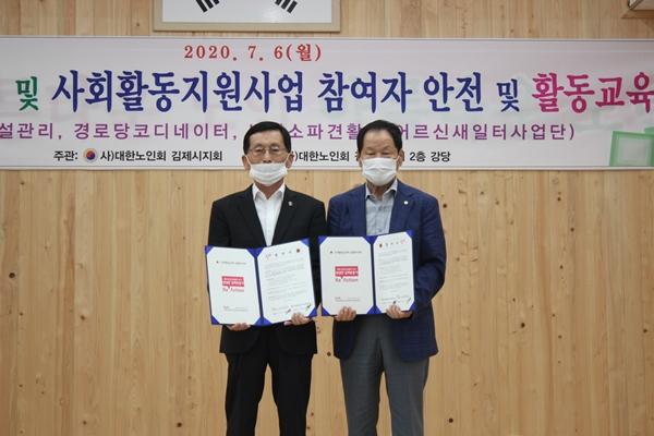 김제시자원봉사종합센터(센터장 허현기)는 지난 6일 대한노인회김제시지회(지회장 이종선)와 업무협약을 노인일자리 활동교육에 앞서 노인회 2층강당에서 체결했다.