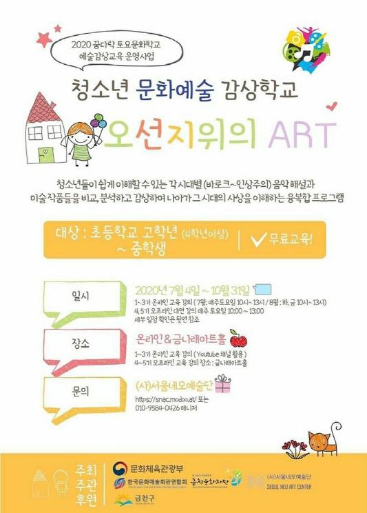 금천문화재단(대표이사 이용진)은 (사)서울네오예술단과 협력해 7월부터 10월까지 청소년대상 문화예술 감상교육 프로그램 ‘오선지위의 ART’를 운영한다고 밝혔다.