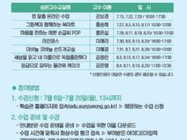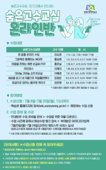 새롭게 모집하는 <숨은고수교실 온라인반>은 양질의 콘텐츠 제공과 양방향 소통 강화를 위해 다회차로 운영되며, 7월 6일(월) ~ 7월 20일(월) 13시까지 은평구평생학습관 홈페이지를 통해 신청할 수 있다. ‘컴 탈출 온라인 수업, 그림책과 함께 하는 북아트, 마음을 전하는 예쁜 손글씨 POP’ 등 총 7개 프로그램이 현재 수강생을 모집하고 있으며 5인 이상일 경우 개설될 예정이다.