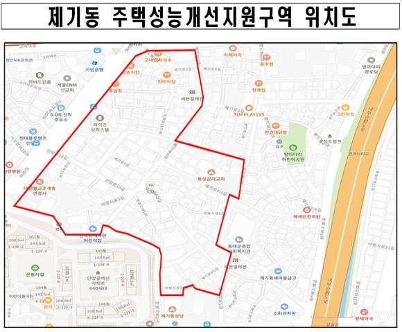 이번에 주택성능개선지원구역으로 지정된 곳은 제기7 재개발정비예정 해제지역이다. 주거환경 및 정비기반시설이 열악하고 노후주택이 밀집한 이 지역은 도시재생뉴딜사업지역 선정에서도 제외되어 생활환경 개선 및 정비가 시급한 곳이다.