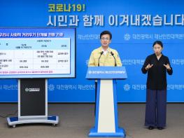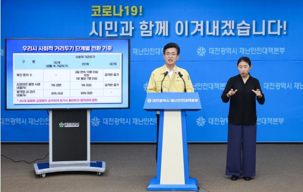 허태정 시장은 사회적 거리두기 단계의 상향 기준과 관련해 “확진 환자 수 기준, 3일 연속 10명 이상 발생하거나 주당 평균 1일 7명이상 발생할 경우, 감염경로가 불분명한 사례 발생 비율이 5% 이상일 경우, 방역망 내 관리 비율이 80%미만일 경우 등을 종합적으로 검토해 단계 조정을 결정할 것”이라고 기준을 밝혔다.