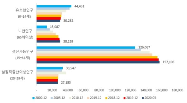 ?총인구 `00년 184,491명→`20년 225,013명 (21.9%?) ?유소년인구(0~14세)는 `00년 44,451명→`20년 30,282명 ?노년인구(65세이상) 00년 13,087명→20년 30,159명 ?생산가능인구(15~64세) `00년 126,067명→20년 157,106명 ?실질적 출산여성인구(20~39세) `00년 33,547명→`20년 27,183명이며, 65세이상 인구의 비중은 13.87%로 고령사회이다.