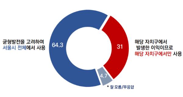 조사결과, 서울시민 64.3% 개발사업을 통해 발생하는 공공기여금을 ‘균형발전을 고려하여 서울시 전체에서 사용해야 한다’고 생각하는 것으로 나타났다. ‘해당 자치구에서만 사용해야 한다’는 의견은 31%에 그쳤다.