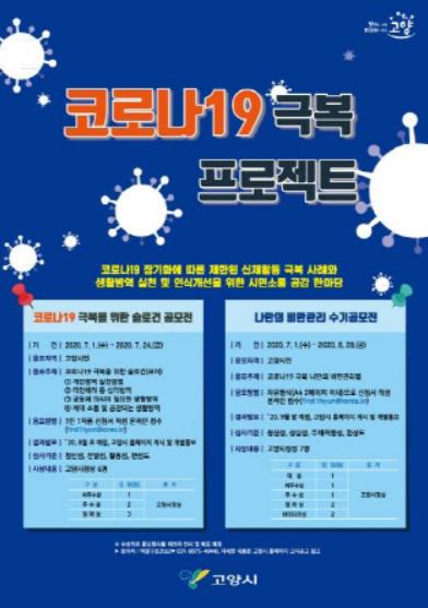 고양시(시장 이재준) 덕양구보건소는 코로나19 극복프로젝트 일환으로 ‘코로나19극복을 위한 슬로건 공모전’과 ‘코로나19극복 나만의 비만관리 수기공모전’을 실시하고 있다.
