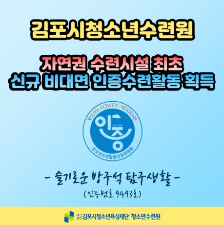 (재)김포시청소년육성재단 김포시청소년수련원(원장 조성훈)이 자연권 수련시설 최초로 여성가족부 청소년수련활동인증위원회 심의 결과 신규 비대면 청소년수련활동 ‘슬기로운 방구석 탐구생활’의 인증을 획득했다.