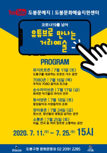 야외공연에 어려움을 겪고 있는 도봉구 거리예술단을 위해 마련된 이번 ‘유튜브로 만나는 거리예술’ 온라인공연에서는 가요, 밴드, 트로트, 악기연주, 뮤지컬 등 다양한 장르의 무대가 풍성하게 펼쳐질 예정이다.