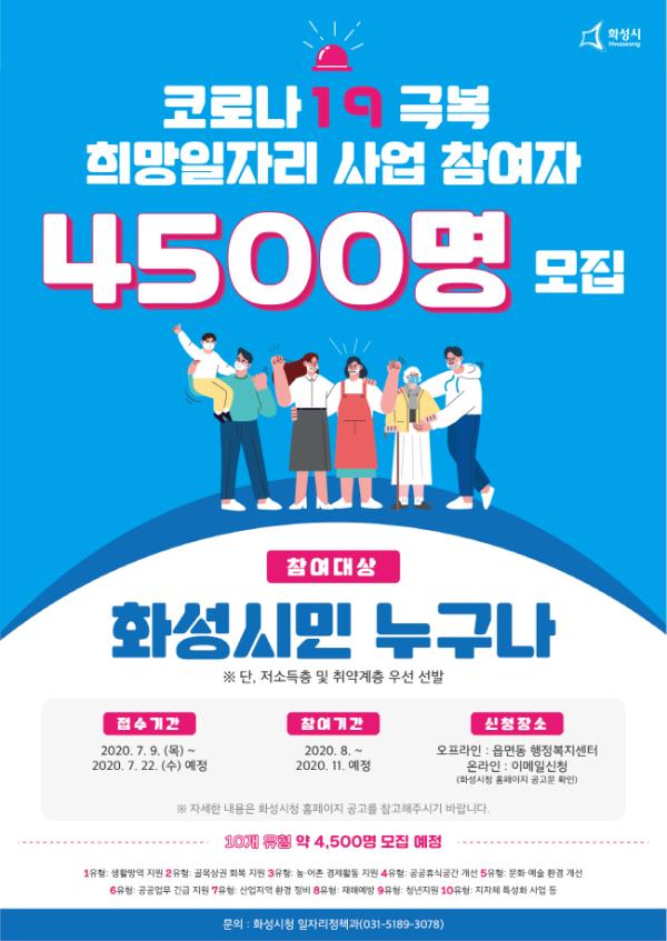 화성시가 코로나19 장기화로 실업 등 어려움을 겪는 시민을 위해 총 4천500개의 공공일자리를 마련했다.