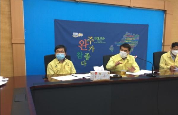 박성일 완주군수는 10일 오전 군청 4층 영상회의실에서 ‘코로나19 관련 대책회의’를 갖고 외국인 유학생 관리, 해외입국자 자가격리, 생활 속 거리두기 등의 대책에 대해 심도 있게 논의했다.